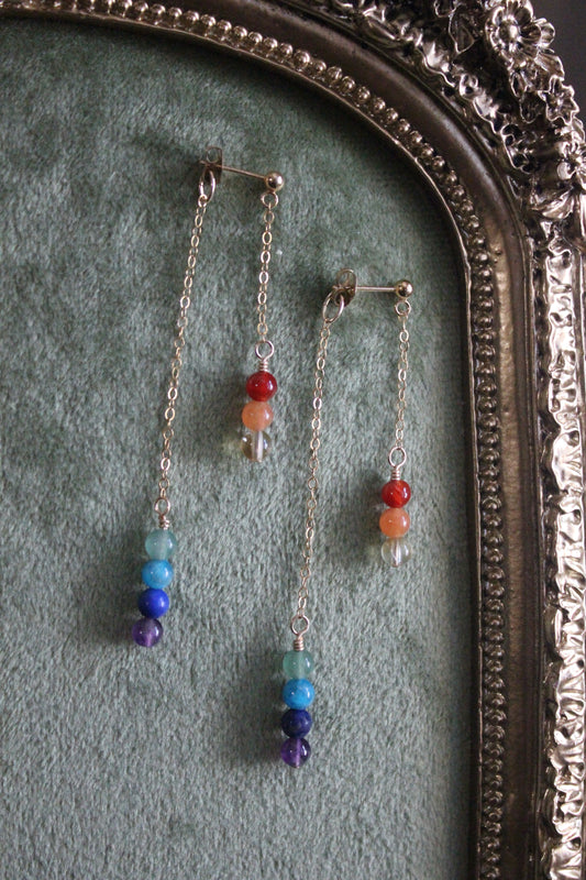 Our Visible Light collection features seven different gemstones representing each color of the rainbow: red carnelian, orange aventurine, citrine, green aventurine, apatite, lapis lazuli, and amethyst. This collection explains how white light separates into its component colors when refracted through water droplets, creating the phenomenon we know as a rainbow. When it's separated, we see the spectrum: Red, Orange, Yellow, Green, Blue, Indigo, and Violet (ROY G BIV). Then, the light reflects off the back of the droplet and exits. Different colors exit at slightly different angles, creating the arc we see. Red light has the longest wavelength and violet has the the shortest, explaining why red always appears on the outer edge of a rainbow and violet on the inner edge.