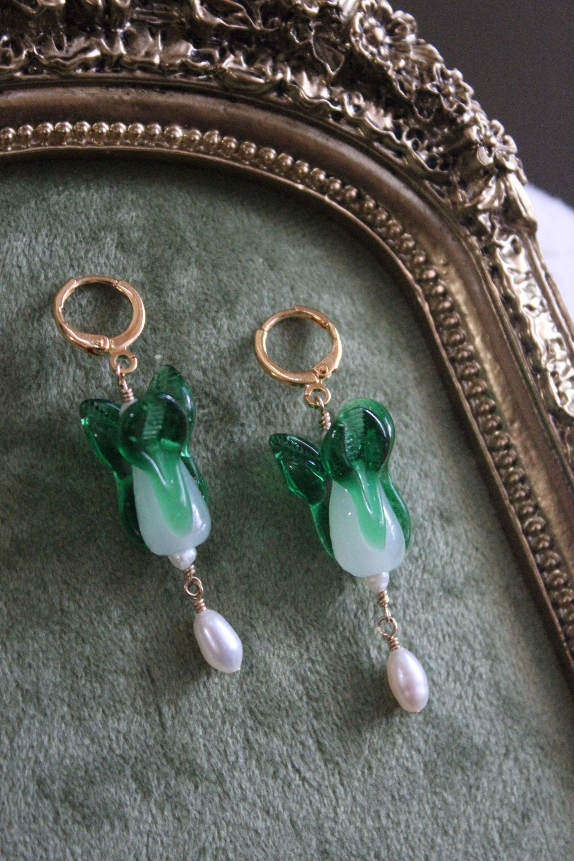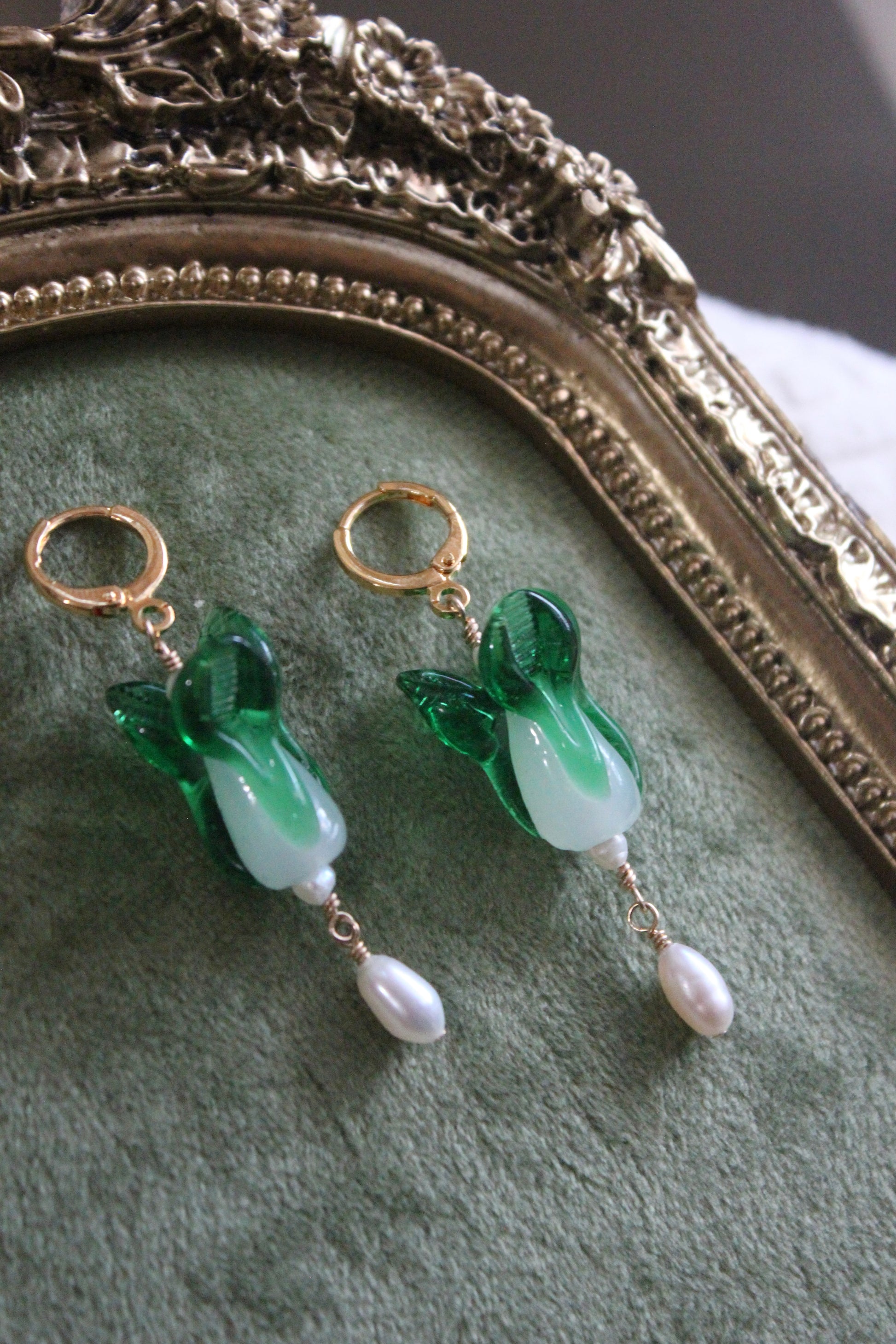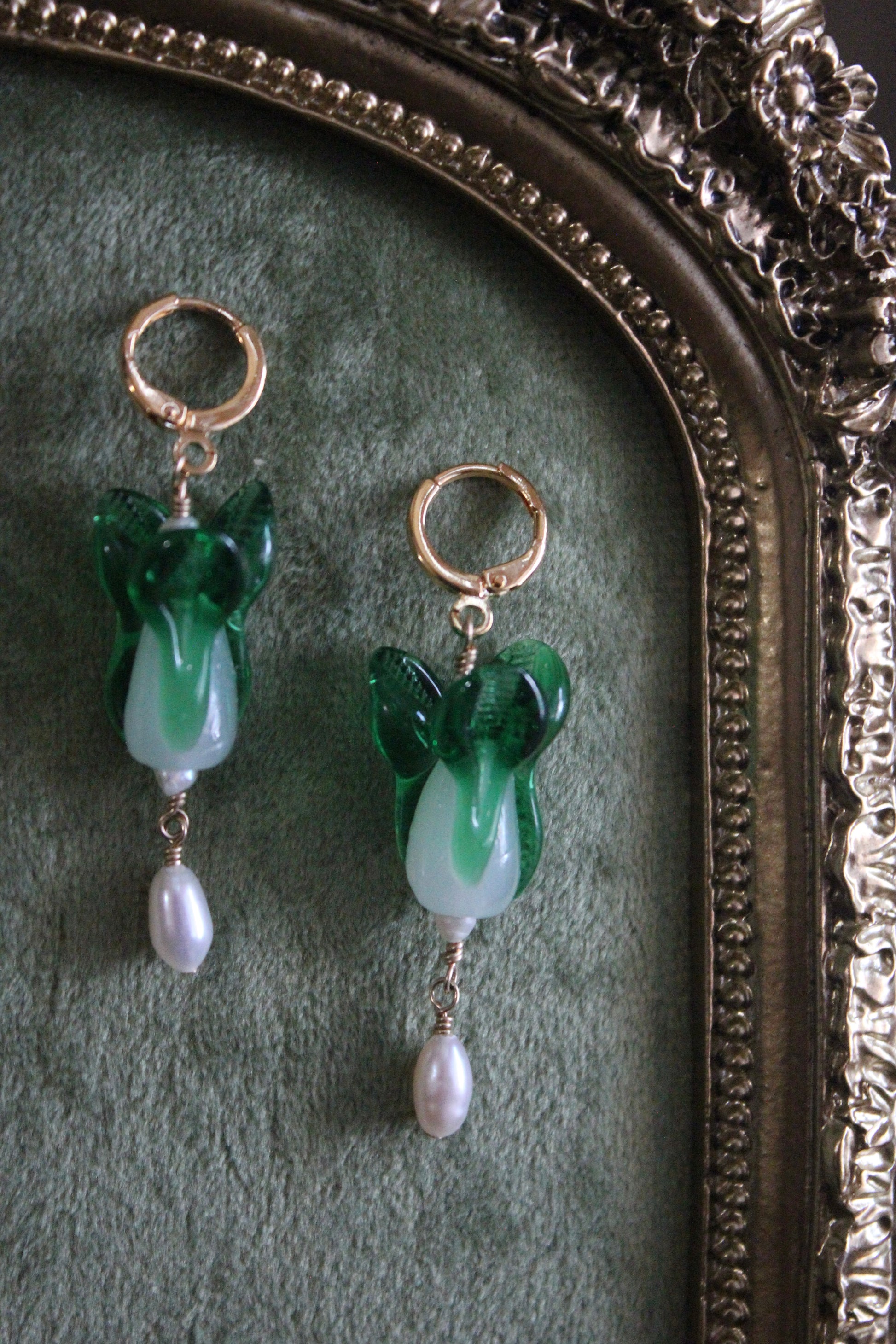 The bok choy pearl huggie’s fancier sister <3 Handmade with lampwork glass bok choy beads and baby freshwater baroque pearls, these earrings add a quaint touch to any outfit! Due to their short length, they are small enough to be subtle while still being an eye-catcher!