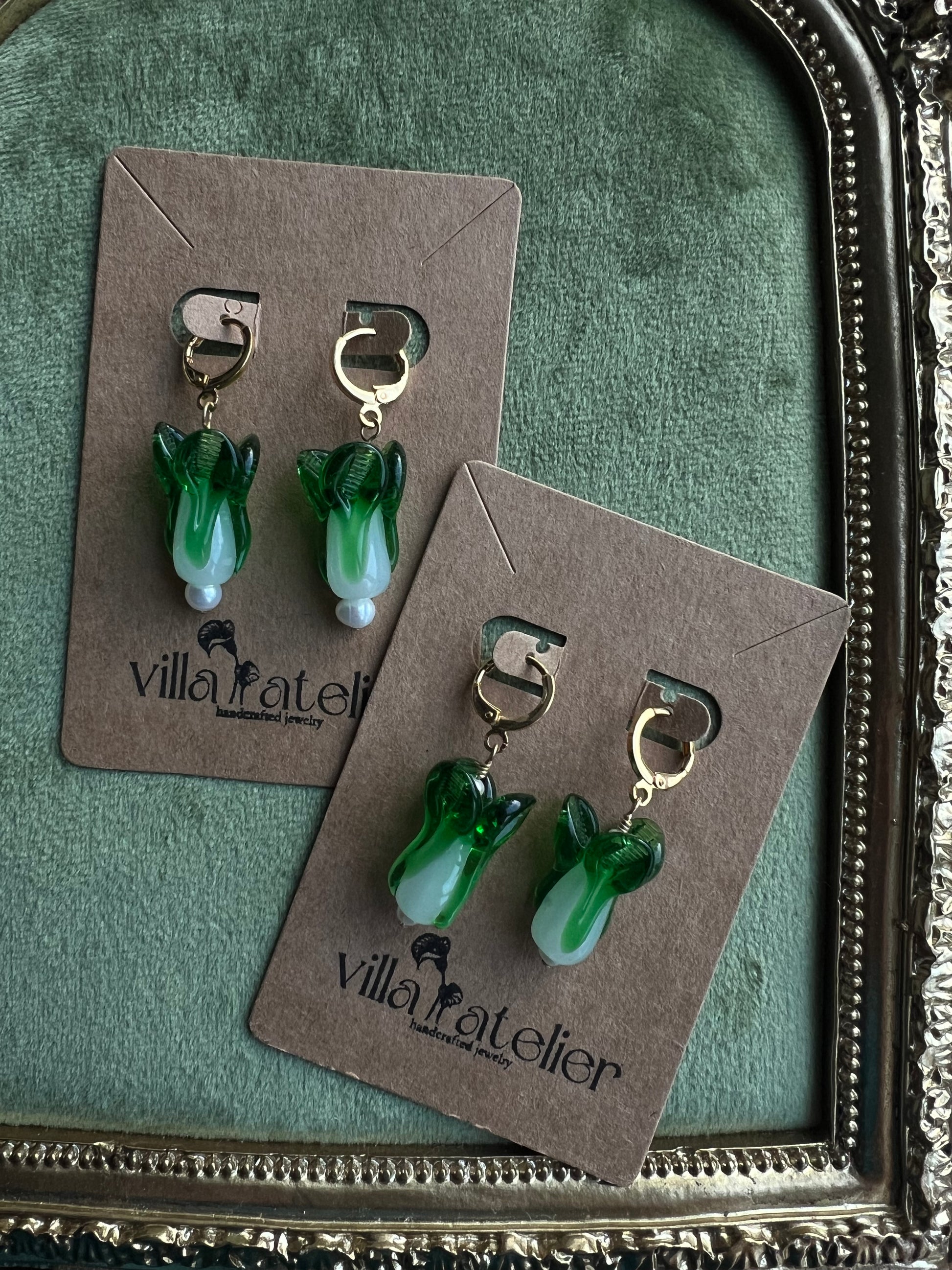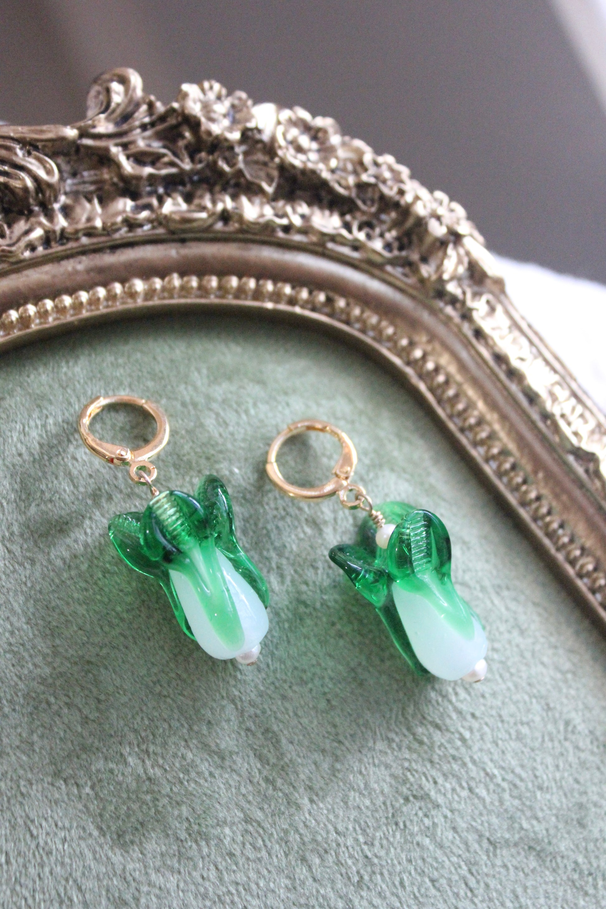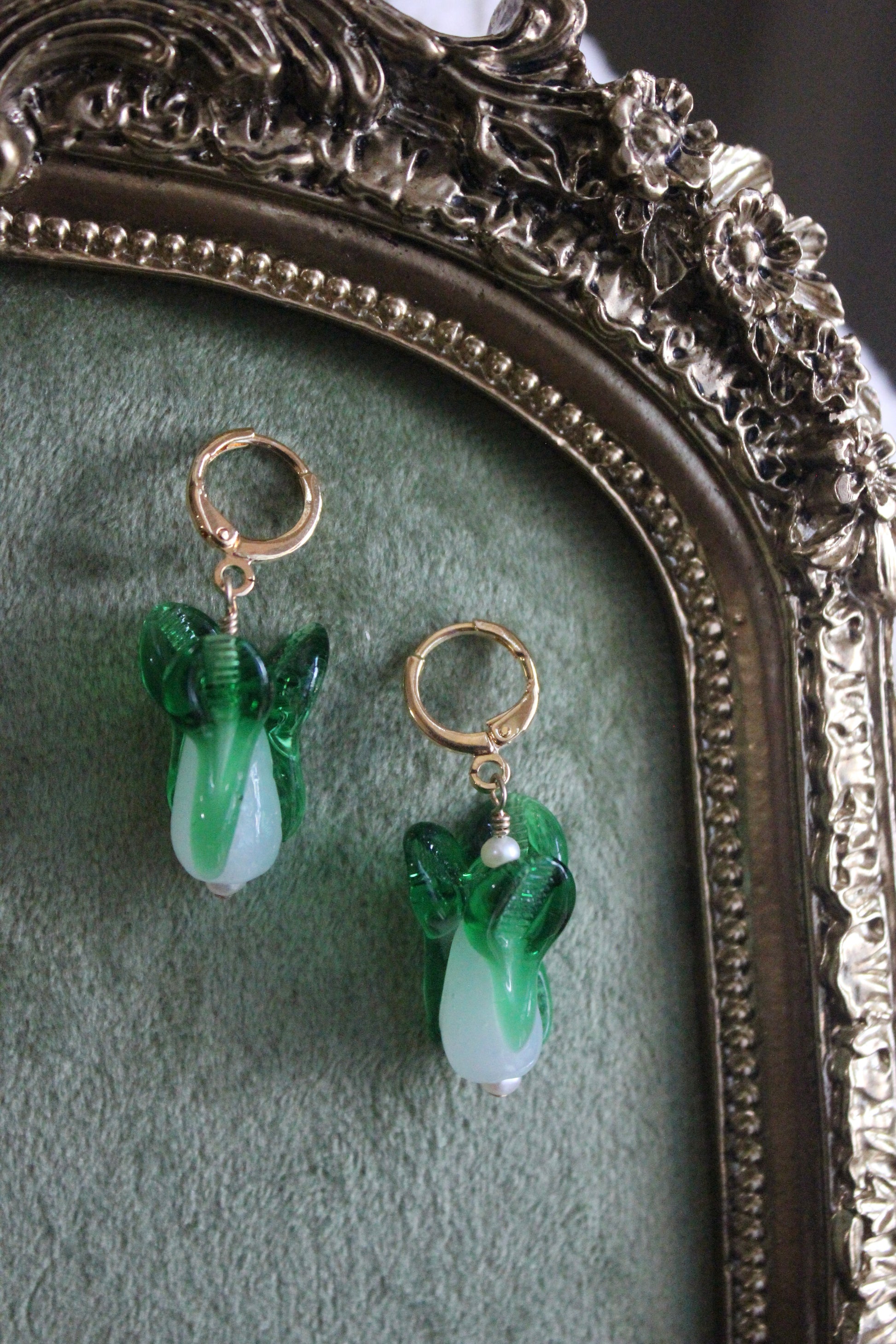 Handmade with lampwork glass bok choy beads and baby freshwater baroque pearls, these earrings add a quaint touch to any outfit! Due to their short length, they are small enough to be subtle while still being an eye-catcher!