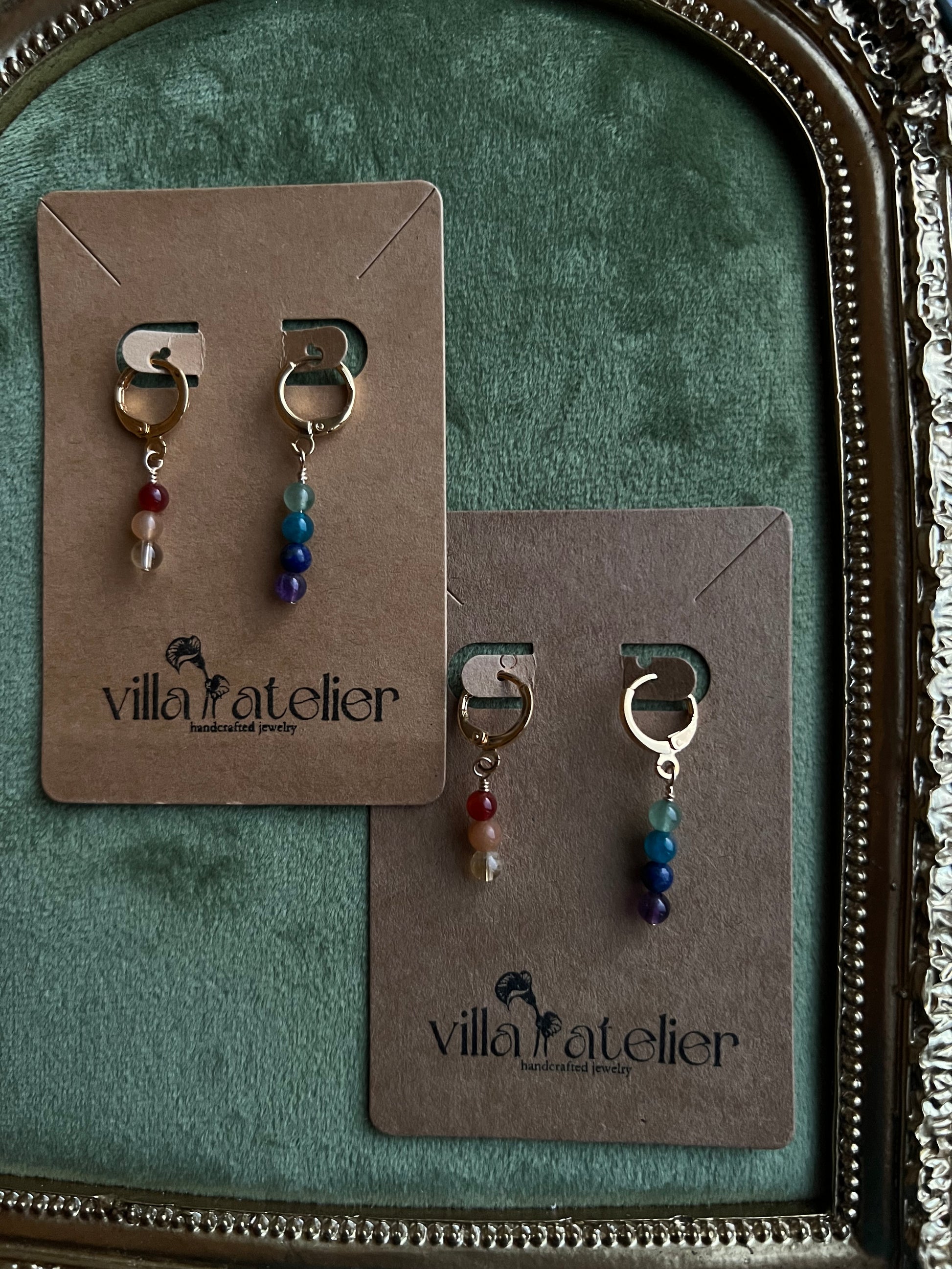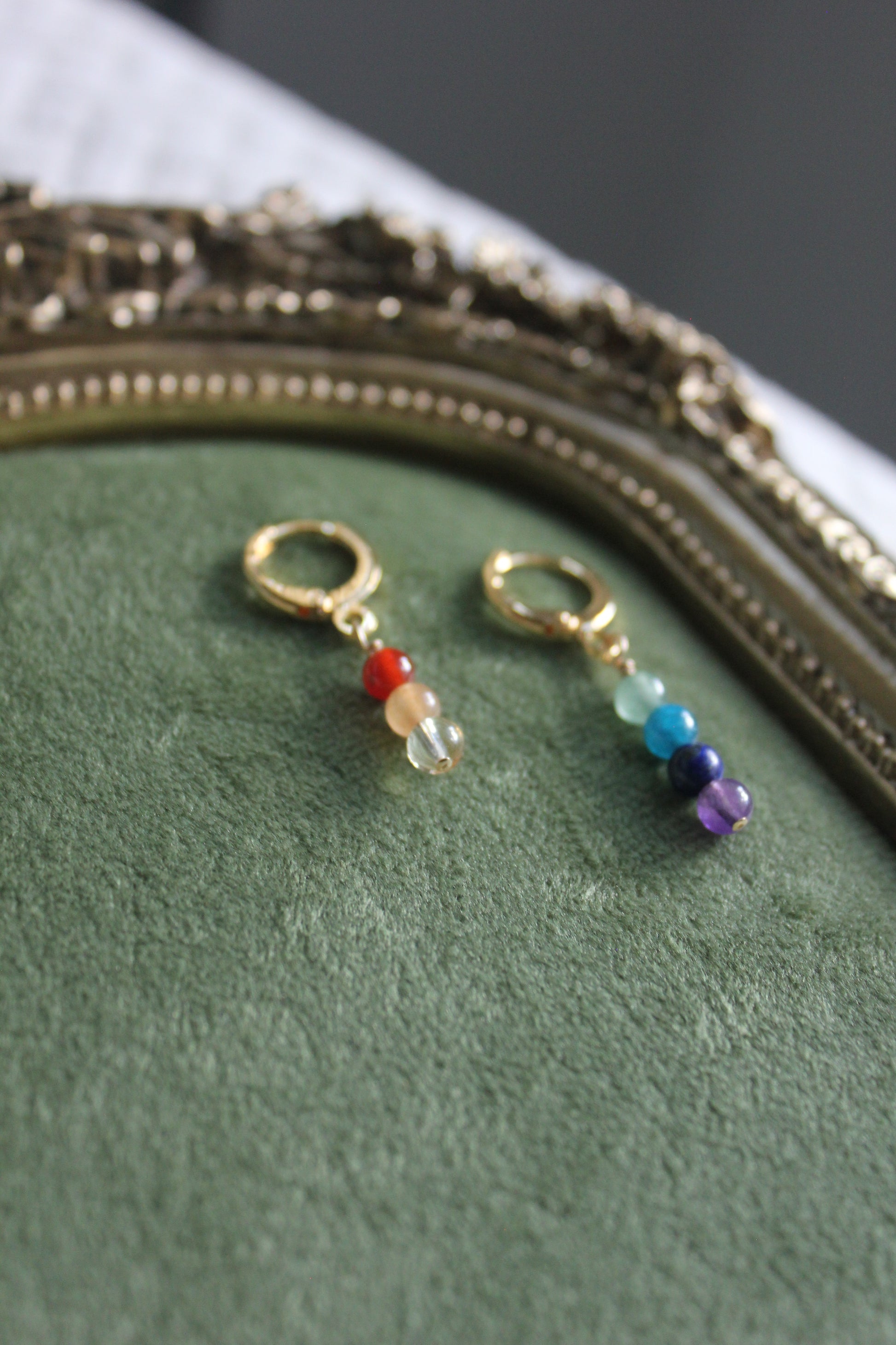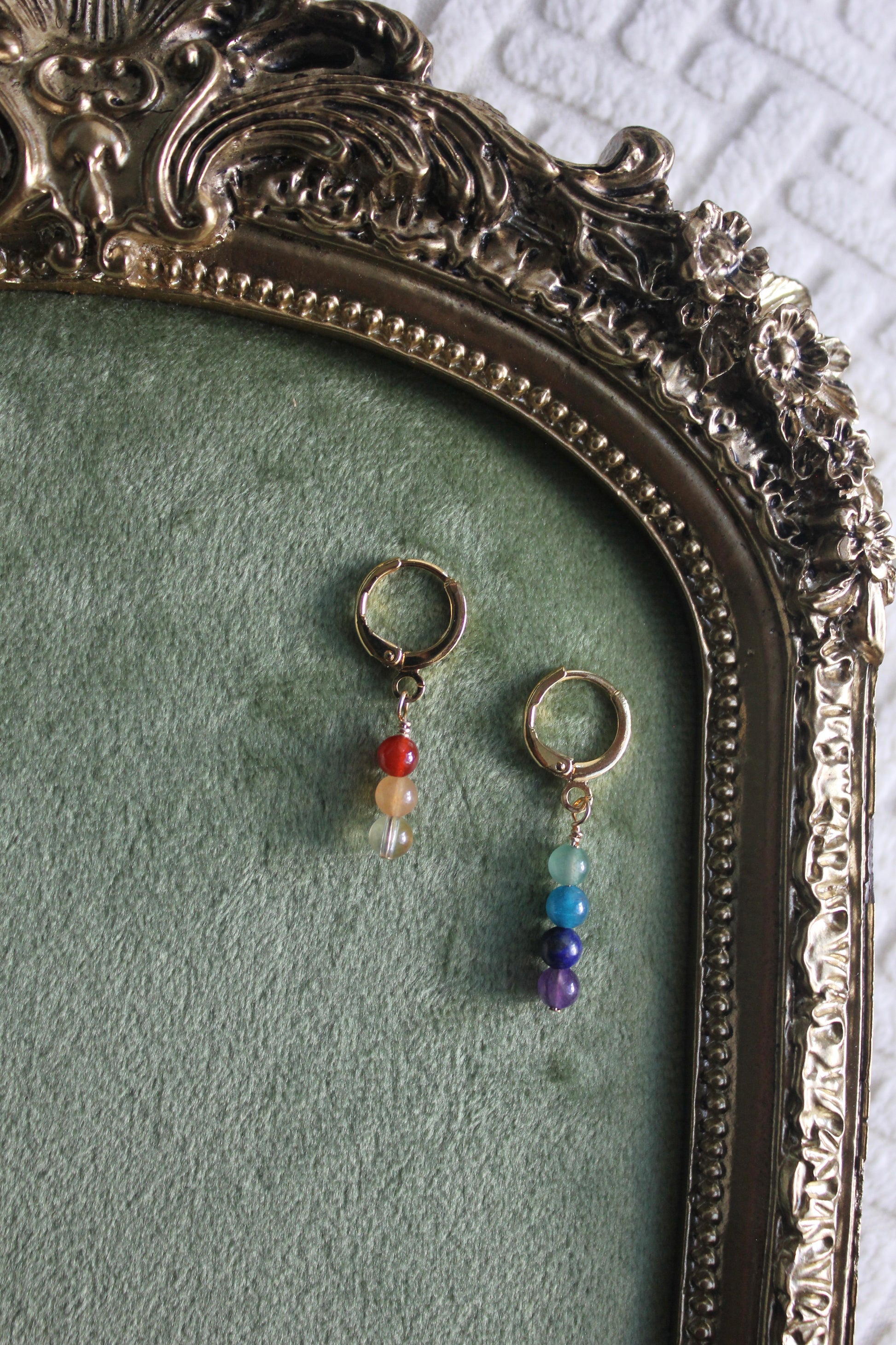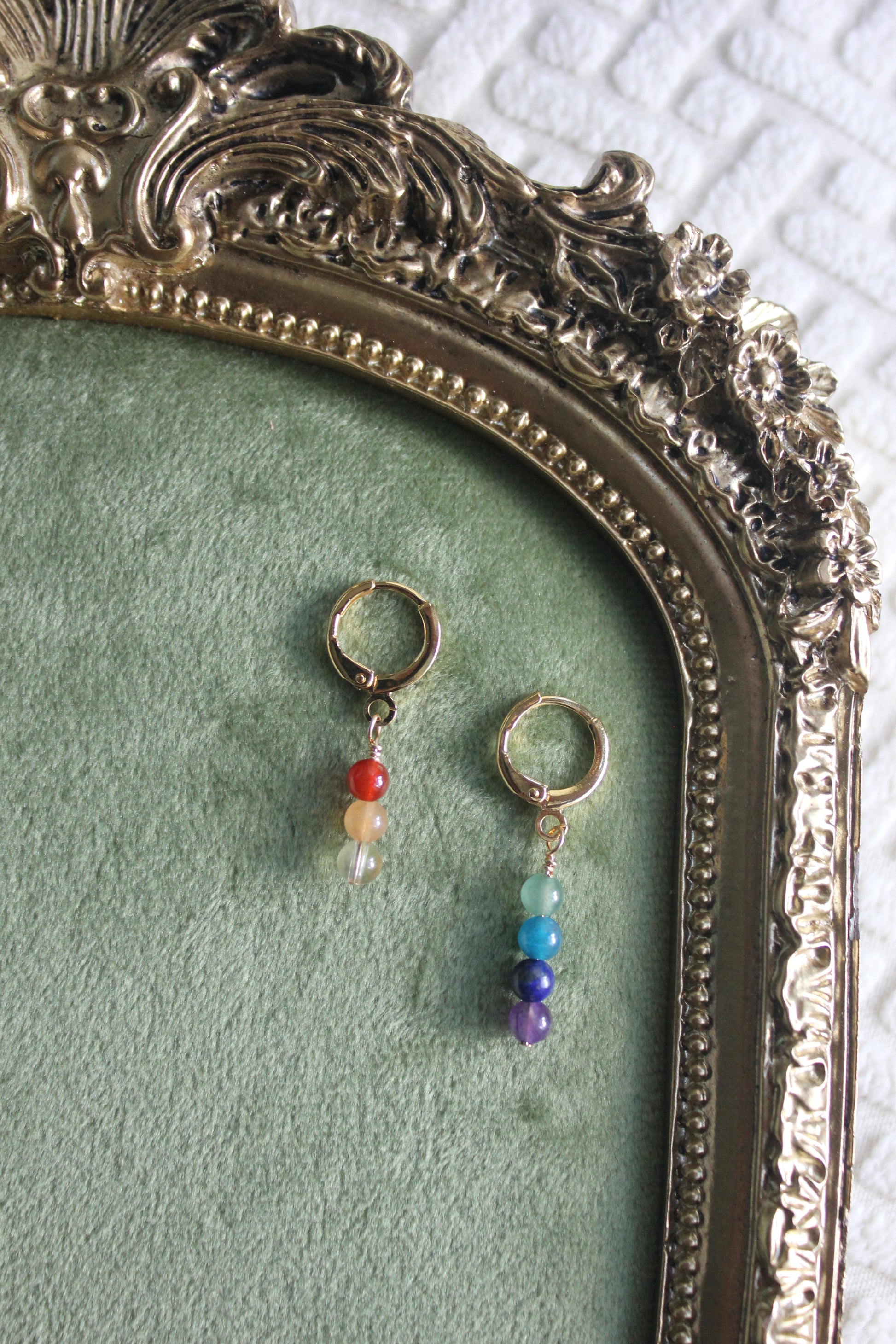Add a pop of color to your outfit with these stunning rainbow drop huggies! The huggies showcase genuine red carnelian, orange aventurine, citrine, green aventurine, apatite, lapis lazuli, and amethyst gemstones.